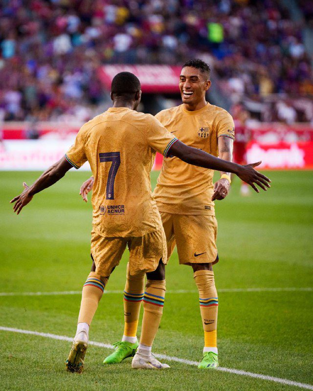 De tanto insistir, o Barcelona abriu o placar aos 39′ após linda jogada de Raphinha, que deu assistência para Dembelé bater rasteiro e explodir a Red Bull Arena.