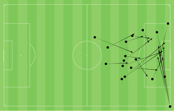 (Mapa de Calor últimos cinco jogos Carlos Vela – InStat)